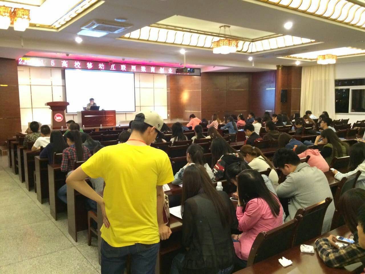 主讲嘉宾范金鹏老师进行了移动互联网营销和高校创业的演讲,紧紧围绕微商创业者的动机、创业的机遇等方面进行了详细的讲解,赢得了现场学生的积极回应和热烈掌声。尤其是活动现场掀起了全场的高潮,极大地鼓舞了同学们的创业斗志。